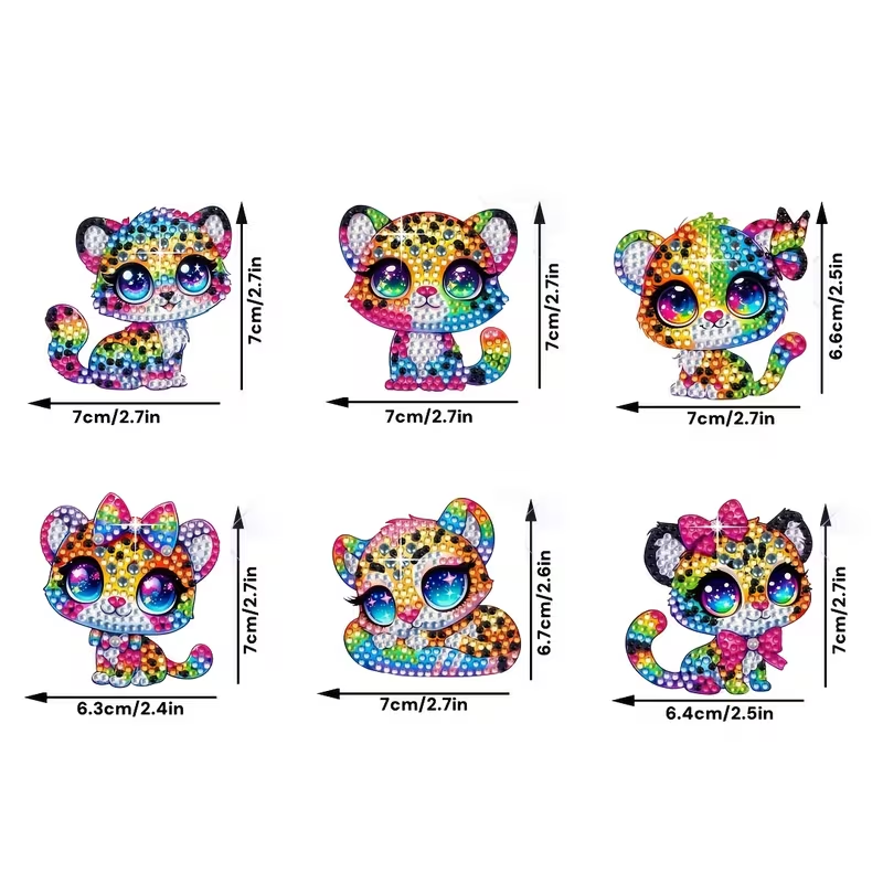 Sada 6 ks kreslených kočiček pro diamantové malování. S kulatými diamantovými uměleckými materiály z PET, vybavená magnety vhodnými na ledničky,