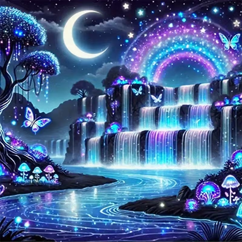 Diamantové tvoření s nočním vodopádem, kompletní 5D diamantová malířská sada s kulatými diamanty a všemi potřebnými nástroji.