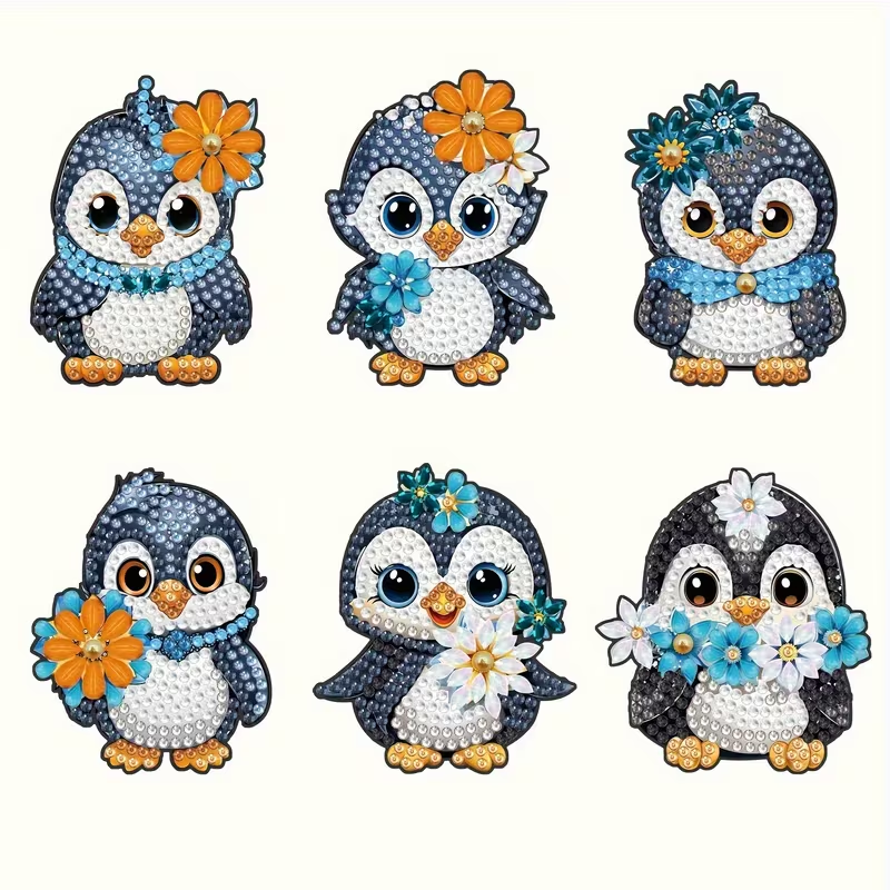 Sada 6 ks kreslených tučňáků pro diamantové malování. S kulatými diamantovými uměleckými materiály z PET, vybavená magnety vhodnými na ledničky,