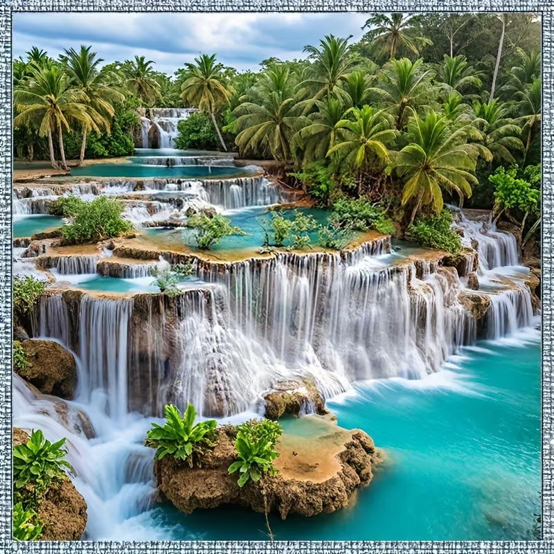 Diamantové tvoření s letními vodopády, kompletní 5D diamantová malířská sada s kulatými diamanty a všemi potřebnými nástroji.