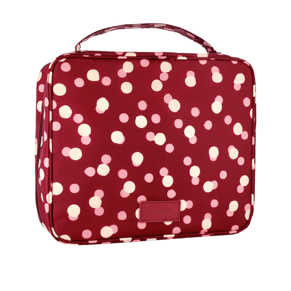 Tato praktická, překrásná toaletní taštička hravě uloží vaše oblíbené výrobky – ať už se chystáte na cesty, nebo si chcete zorganizovat koupelnu. Tři oddělení na zip plus tři síťové kapsičky – a veselý vzorek růžových puntíků. A jestli vám ani tohle nevykouzlí úsměv na rtech, rozhodně vás potěší chytrý háček na zavěšení a fakt, že taštička je vyrobena z recyklovaného polyesteru.